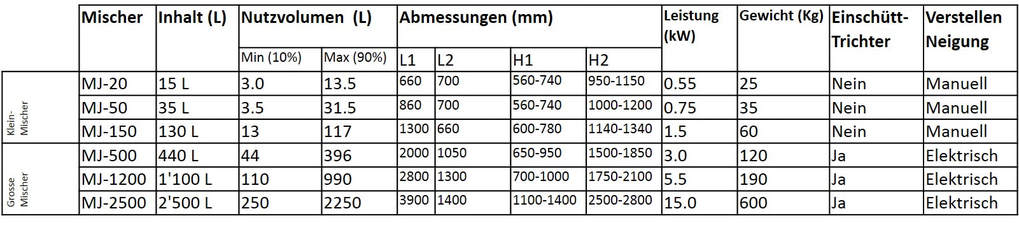 • Kurze Mischzeiten: Einige Sekunden bis einige Minuten je nach Mischergrösse und Produkt.